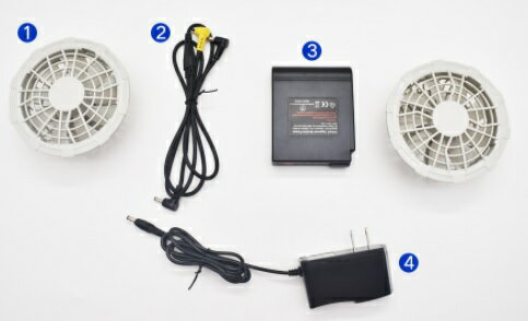 【ハイパワーファンセット】 セット: ファン×2 、ファンケ-ブル×1 【バッテリー】 大容量充電式リチウムイオン電池 セット:リチウムイオンバッテリ×1、充電ケーブル×1